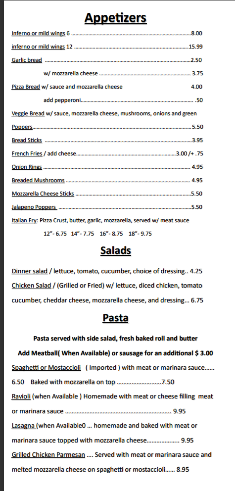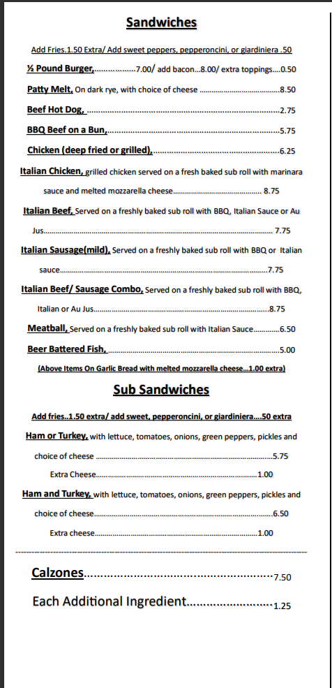 Overall, the menu reflects a simple, welcoming approach where good food meets a relaxed, approachable setting, making it an easy choice when craving classic pizza flavors or hearty sandwiches.