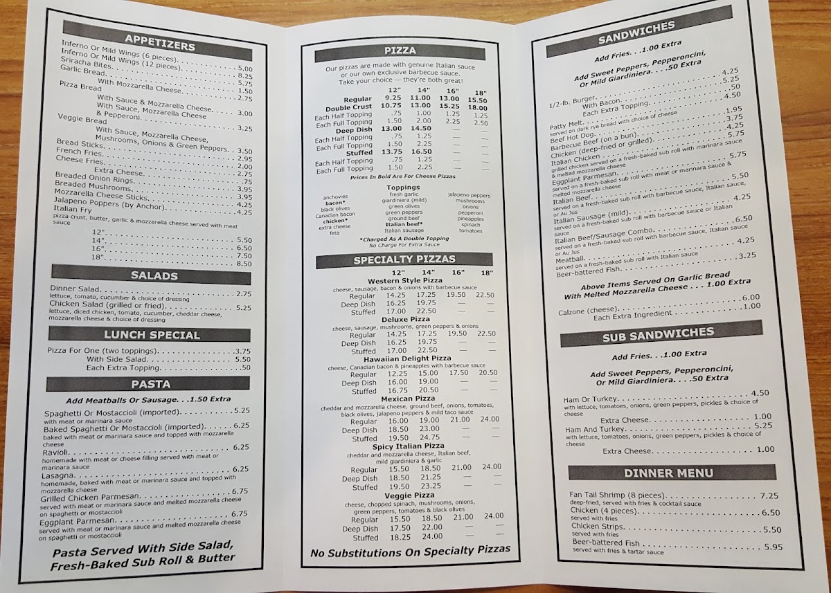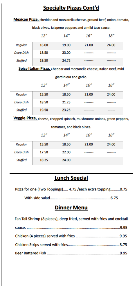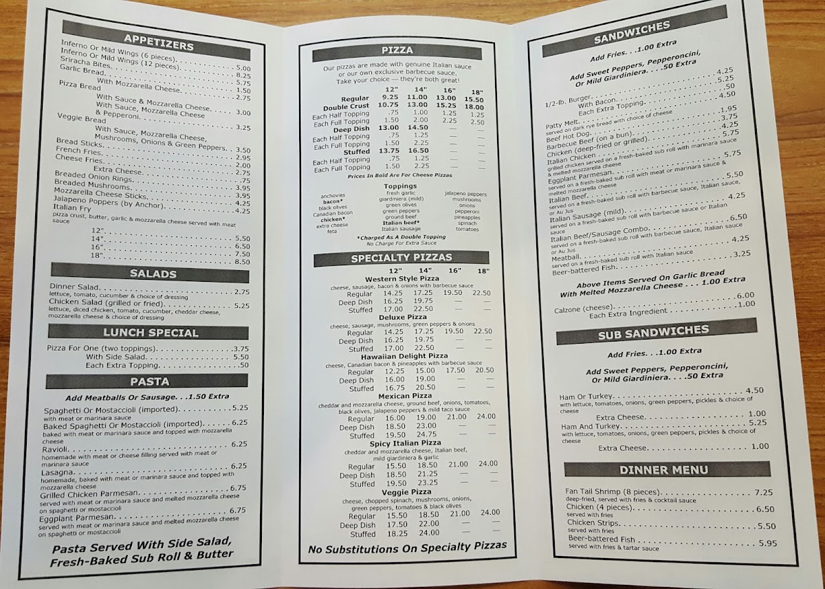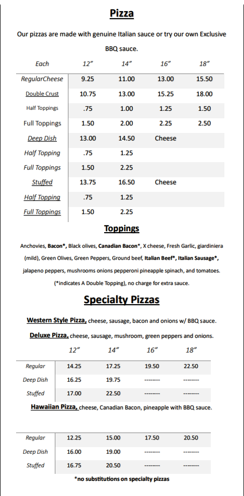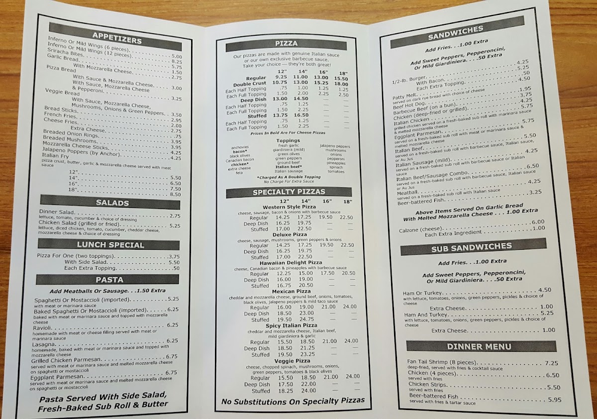 The menu features classics like pepperoni and pepperoni-pineapple pizzas alongside heartier options such as Italian beef and various sub sandwiches. For those seeking a bit more variety, salads and distinct pizza styles—from Western to Mexican—offer something for different tastes and times of day.